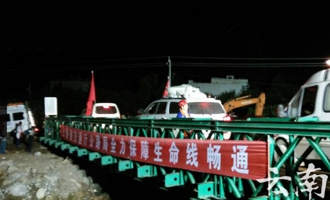 8月5日晚上10时,经过数十个小时的连续作战,通往震中重灾区龙头山镇龙泉河两岸的钢架桥架设完成并通车。这段30米长的钢架桥,是确保运送救灾人员和物资顺畅的生命线。据介绍,钢架桥架设工程由曾参加过汶川地震抢险救灾,有丰富钢桥架设经验的曲靖公路管理总段应急保障队和昭通公路管理总段抗震抢险保通队伍合力完成,现场有100余人参与架桥施工。早在5日凌晨5时,运送5座钢架桥构件的车队就抵达了目的地龙泉乡,但是受现场地质情况复杂、作业面窄等困难影响,架设工作进展进展较慢。8月5日晚22时,在克服重重困难之后,省公路局顺利完成葫芦村龙泉河30米双排单层加强型装配式公路钢架桥的架设任务。此前,距离施工桥梁1公里处原本有1座仅能供行人通过的小桥,为了保障大型设备和物资的运输,钢桥的架设对抢险救灾的意义举足轻重。