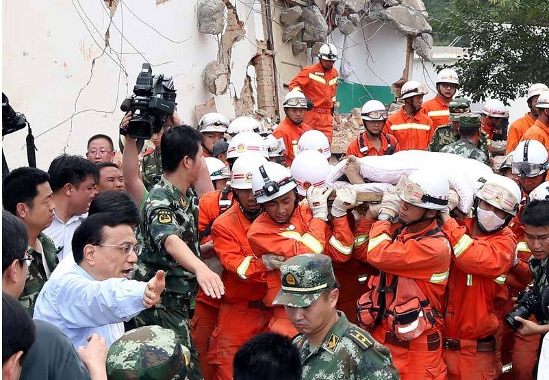 8月4日,受中共中央总书记、国家主席、中央军委主席习近平委派,中共中央政治局常委、国务院总理李克强代表党中央、国务院,代表习近平,飞赴灾区,察看灾情,现场指挥抗震救灾工作。李克强飞赴地震灾区后,乘车赶往此次云南鲁甸地震的震中龙头山镇,并徒步5公里多来到震中受灾最严重的龙泉村,实地察看灾情,指挥抗震救灾工作,看望慰问受灾群众。新华社记者姚大伟摄