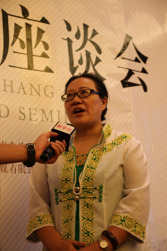 凉山州彝学会副会长博史阿尕在《魅力西昌》发行座谈会上授受新华社等媒体采访【李春摄】