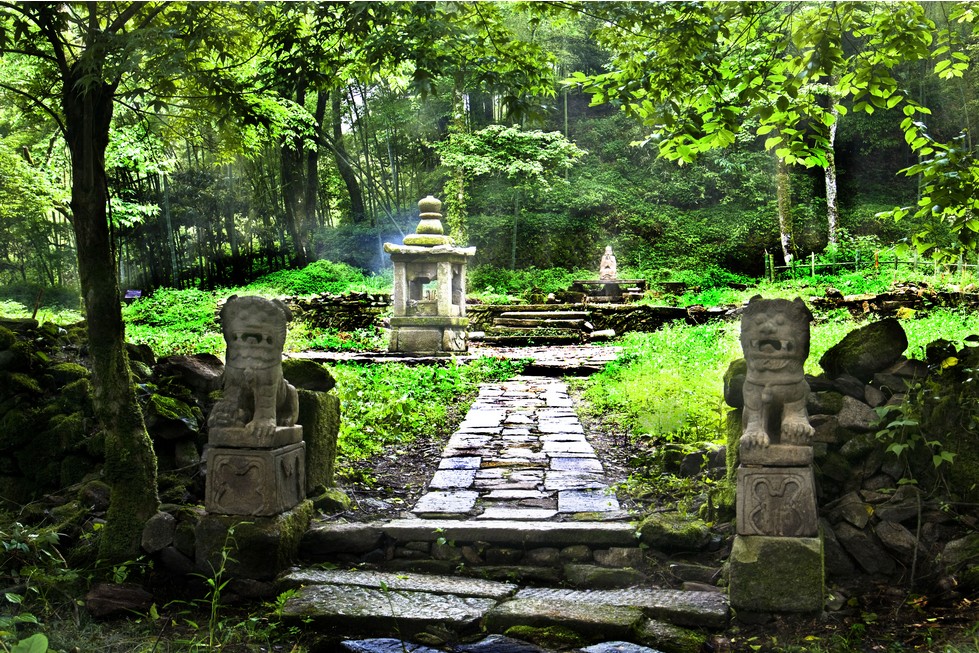 行至图坪庵遗址区域,即现在箕峰景区入口,有一个体形较大的香炉,匾额上书“一路福星”四个大字,愿望亦十分美好,据考测,这里之前应有大的宫观,现仅遗留墙脚。此处有唐朝始栽的两棵银杏树,至今已有1300年,《武功山志》中记载,“东华西实,来年易之”,即今年东边的树开花,西边的树结果,明年则互换过来,很是特别。