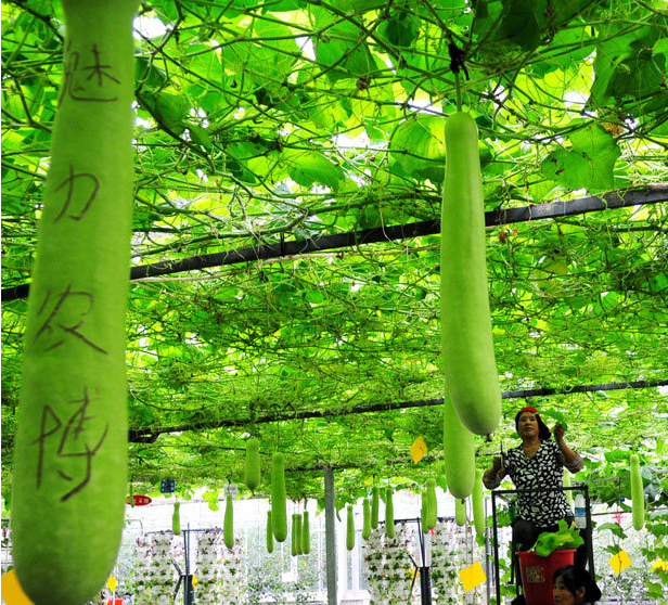 在高新设施农业展馆中,主要展示6万平方米智能温室“无土栽培综合区”、“基质栽培区”、“南果北种区”、“鲜切花园”和“ 植物工厂”5个特色种植区。“无土栽培综合区”和“基质栽培区”更新品种、技术和项目,种植120多个蔬菜优良品种,展示移动式平面栽培、大型树状栽培技术和旋转式、垂吊式、三角式等多种立体栽培模式,新增适于家居栽培的盆栽保健蔬菜、家庭园艺品种及相关技术模式。新设“南果北种区”,引进种植香蕉、木瓜等南方果树品种。“鲜切花园”改造提升,新增40多个名贵稀有鲜切花品种和30多种南方大型特色绿植。整个6万平方米温室集高新科技、优良品种、前沿设施、观光景致、创意理念于一体,打造现代农业大观园。