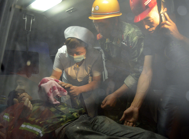 医护人员在救护车里给受困人员检查身体