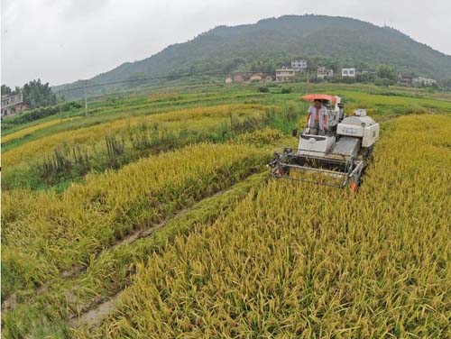在湖南祁阳县潘市镇,郝金波开着他的进口收割机在田里工作