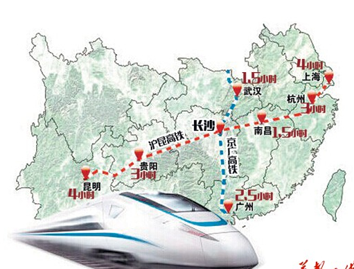 今年年内,沪昆高铁杭长段将通车,并无缝对接已通车的沪杭段,长沙到上海将由现在的7个小时缩短至4个小时,再加上之前开通的京广高铁,长沙正构筑出“1.5小时到武汉、南昌,2.5小时到广州,3小时到深圳、郑州、杭州,4小时到上海,5小时到北京”的高铁出行新版图。