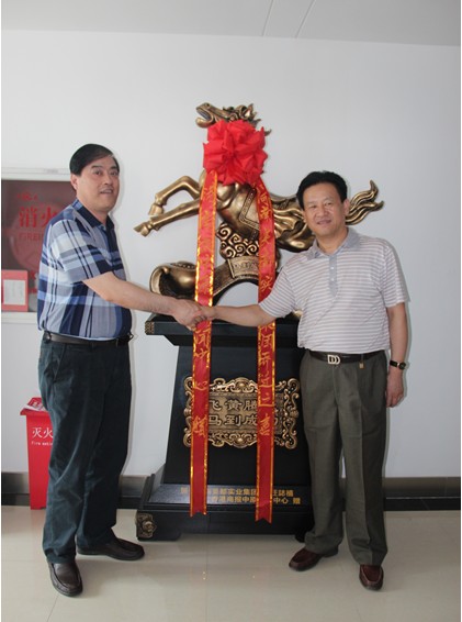 香港商报社长助理、香港商报中原新闻中心主任刘国敏与河南美都实业集团董事长尹海军握手,祝贺河南美都乔迁之喜