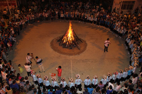 秋收开镰“祭萨”活动上,侗族同胞围着篝火踩歌堂