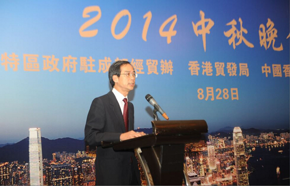 香港特区政府驻成都经贸办主任刘锦泉在中秋晚会上致辞,他说,香港与四川的经贸关系非常紧密。在2013年,港川两地贸易总额达到50亿美元,同比增长45%。在投资方面,香港是四川最大的境外投资来源地,截至2013年底,香港在四川投资超过4,500家企业,投资金额达到270亿美元。
