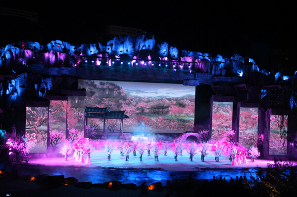 【香港商报讯】记者孙刚报道:经过为期2年时间的精心策划、创意、设计和编排,全方位展示土家摆手舞、木叶情歌、薅草锣鼓、面具阳戏、哭嫁、西兰卡普等优秀的民族文化形态的大型实景歌舞剧《梦幻桃源》,8月28日晚在重庆酉阳县桃源大舞台首演,撩开了她绚丽而神秘的面纱。今后,到酉阳旅游观光的海内外游客,均可在桃源大舞台欣赏这穿越千年时空的世外情缘。