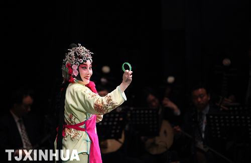 天津市青年京剧团演员刘淑云在表演京剧《拾玉镯》。(来源: 新华网)