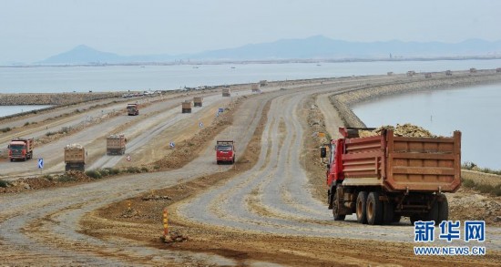 9月14日,在辽宁省大连市甘井子区北部的大连新机场建设工地,运输土石方的重型卡车穿梭忙碌。由于大连周水子国际机场已经超负荷运行,运输能力即将达到饱和,大连采取离岸填海的方式建设金州湾国际机场项目,目前该项目的总平面图(概念性规划)及新机场沿岸商务区——概念性总体规划已经亮相。新华社发(刘德斌 摄)