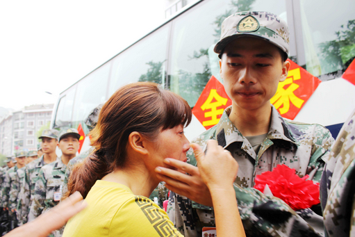 来自南明镇大洋村杨兰梅,昨天高高兴兴的把儿子送到了县人武部,而今在长长的欢送队伍中,看到儿子马上要登上送兵车离开剑河时,她抱着儿子泣不成声,儿子张秀俊也一个劲为母亲拭去如潮的泪水……