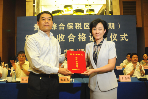 海关总署加贸司副司长李志辉向贵阳综合保税区管委会主任李瑶颁发合格证书