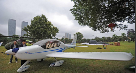 9月19日,两位参观者在参观一架由湖南山河科技股份有限公司生产的“欧若拉”型飞机。
