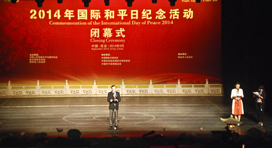 中共陕西省委常委、西安市委书记魏民洲在闭幕式上致辞,他说,作为世界历史文化名城,西安在3100多年的建城史和1100多年的建都史中,处处闪烁着珍视和平、维护和平的探索与追求,历久弥新。今天,西安积极的践行习近平主席共建丝绸之路经济带的战略构想,全力叫响做实丝绸之路经济带的新起点,以更加开放的姿态,向世界展示独特魅力和时代风貌,一个和谐美丽的西安将更加紧密的拥抱世界。