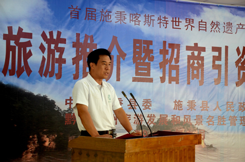 推介会上,施秉县委书记彭世平说,施秉有着丰富的土地、生物、旅游、水能资源以及独特的气候、良好的生态环境,为发展以凸显山水风光特色的旅游业、以中药材为主的特色农业及绿色工业提供了得天独厚的条件。随着思(南)剑(河)高速公路的建成和余(庆)凯(里)高速公路的即将建成,特别是施秉喀斯特成功列入世界自然遗产名录,为旅游业大发展带来了前所未有的历史性机遇。