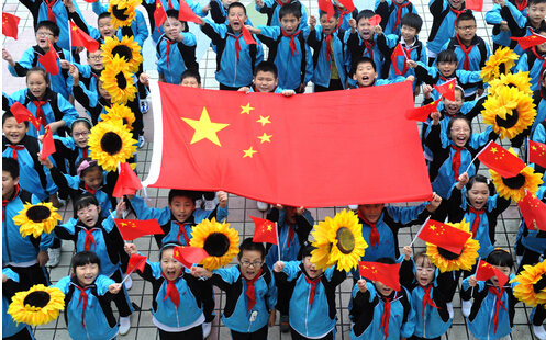 (香港商报讯)通讯员 解琛报道:9月29日,在合肥市瑶海区和平小学,小学生们围聚在鲜艳的五星红旗旁,挥舞着手中的国旗和向日葵花表达心中对祖国母亲的热爱和祝福之情,迎接国庆的到来。