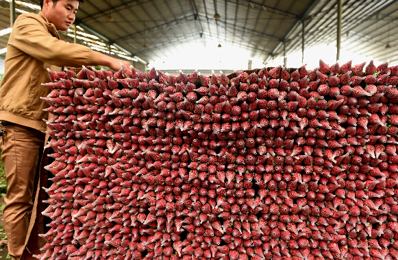 花农在昆明呈贡区斗南花卉市场整理待售的玫瑰花(10月13日摄)。