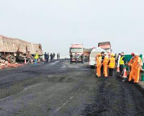 新华网西安10月22日电 (记者 薛天)21日凌晨3时许,西延高速三原段发生一起严重交通事故,一辆拉煤的半挂车失控侧翻后,导致22辆半挂车发生追尾相撞,共十起连环追尾事故。记者22日获悉,目前,事故已造成4人死亡、3人受伤。