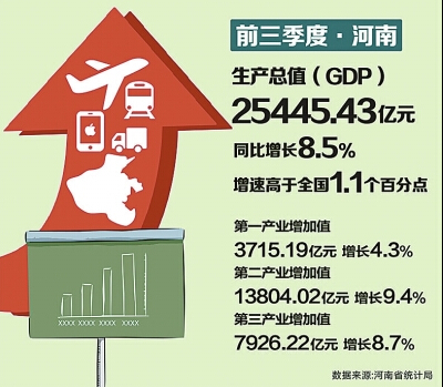 本報訊(記者王冠星)10月29日,省統計局發布消息,初步核算,前三季度河南全省生產總值(GDP)25445.43億元,按可比價格計算,比上年同期增長8.5%,增速高于全國平均水平1.1個百分點。
