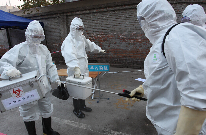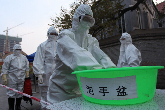 10月30日,在河北張家口埃博拉社區防控演練中,應急隊員在進行出場消毒。