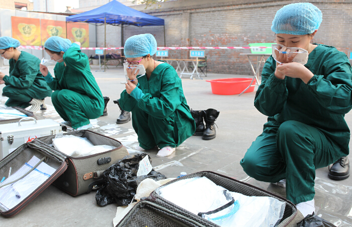 為完善疫情處置流程,提高快速反應和應急作戰能力,河北省張家口市宣化區疾控中心于10月30日舉行埃博拉社區防控演練。演練場景為一名男性埃博拉出血熱密切接觸者回到居住社區,在居家隔離醫學觀察期間出現癥狀轉送至定點醫院,區疾控中心應急大隊前往定點醫院進行應急處置。