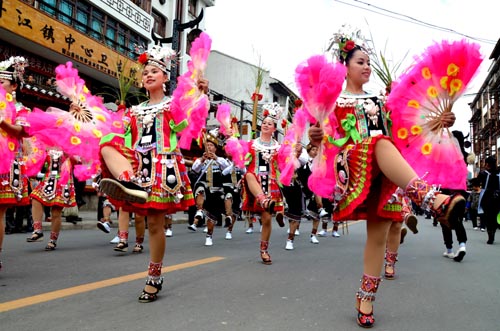3日下午,参加巡游活动的苗族儿女,个个头戴银冠,发髻插银梳,耳配银耳环,颈戴银项圈,腰捆银围腰链,下身着苗家五节群,脚穿苗家绣花鞋,一身华丽装扮,展示着苗家精美的服饰文化,此外还有歌舞生产生活习俗展示。在浩浩荡荡的队伍里,他们手执各种民族音乐器具,或敲敲打打,或载歌载舞,沿着县城街道徐徐前进,有动有静,有跳有唱,场面极为壮观。