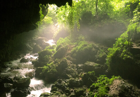 午飯之后,考察團一行來到通靈大峽谷。該峽谷由念八峽、銅靈霞、古勞峽、新靈峽、新橋峽組成組成,峽與峽之間的河流相通,溶洞的三條地下暗河相通,形成三峽三洞連通的大峽谷群。整個峽谷長10多公里,由峽谷、瀑布、暗河、溶洞、原始植被、峰叢絕壁、溪流奇石構成,有“山水小桂林,氣候小昆明”之美譽。以上文字抄襲于百度百科。天公不作美啊,因為下雨導致水量過大,出于安全的考慮,瀑布下的溶洞進不去了,驚險刺激的暗河漂流項目也取消了,因此對于通靈大峽谷的全部印象便是:一條瀑布和一片原始森林。雖然未能領略通靈大峽谷的全貌,但就原始森林景區這一片段已然讓人心曠神怡了,因此有團友不斷稱贊:此處有貨、有料。置身于叢林之間,小心翼翼地踩著濕滑的臺階,光是看看這些未曾見過或只聞其名的各類稀奇古怪的植物,雙眼已是忙得不可開交,直呼大長見識了。不過導游講的那些珍稀植物,我現在基本都忘記了,只記得八角樹之類的,看來有機會還得重游一次。