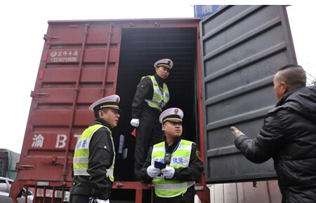 11月13日,為預防重特大交通事故發生,重慶市南岸區公安分局交巡警支隊聯合交通執法、安監等部門正式開展“六打六治”打非治違專項行動,嚴查各類危化品非法運輸和客車違規運營的交通違法行為。無證經營、非法改裝、違規裝載等非法運輸危險品行為,及客車超速、超員等違規行駛已成為交通安全重要隱患。圖為執法人員正在進行運輸車輛檢查。 陳超 攝