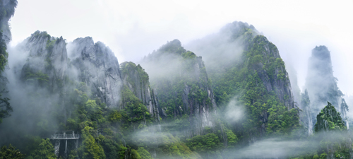 进得东安门,途经一片昏暗的林地,我正埋头顺着一条圆木铺就的小径拾阶而上,突然感觉到前方光亮闪耀,猛抬头,眼前顿时豁然开朗,原来已登上第一个观景台——流云台。放眼放去,只见远山蒙蒙,远树丛丛,幽崖深谷,流溪飞瀑,一片晴岚乍豁,烟蔼葱茏之象,羊狮慕就是这样不经意间呈现在我的面前。“庄生晓梦迷蝴蝴蝶,”这一刹那间我油然而生这种疑惑:造物主,你到底是把羊狮慕放在我面前,还是把我放在羊狮慕面前?惊愕迷惑纠结中又被同行朋友的呼唤声牵引着往前。离开流云台,向左前方行走,只见一悬空栈道在断崖绝壁腰间逶迤穿行,向远方蜿蜒而去。下临绝谷,栈道上行走,真是步步惊心。我只恨不得要捂住那颗简直就要跳出来的心脏,颤巍巍摸壁往前走着…但只少倾即被美景把那份胆颤抛至九宵云外。眼前好一片千岩竞秀,气势雄壮,浑然天成的景象。而愈往前行,就愈有曲折转合之妙,姐妹峰、点将台、十八排、穿云石笋、金鸡归巢、如来神掌、虚怀若谷、关公凯旋、杨母抱子…一座座奇峰异崖有序无序,分布于约几个平方公里的范围内,它们遥相对望,似有低语、似有婉唱,真真“步移景易”。其峭拔峰峦,尽显山川开合之势,仿佛画家用墨笔作大斧劈皴,那些横斜旁逸的松树,无不呈迎客之态……所有这些,不仅是大自然的鬼斧神工,也是画家和摄影者的律构之像。其间韵味,自知语言无法全尽其意。其实,暂且不去论山是什么形,水是什么态,也不用深谙美学,只需有眼耳鼻,略懂生活情趣,便能深浅自知,将美景尽收眼底、心间。