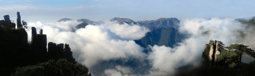 在姐妹峰附近的危崖绝壁上,还有一绝好去处,乃一块三五十平方的平地,远远地看去,这地儿已然尽得地利之妙,身在其中时,更觉是无敌观景之境。此处名为“凌云台”,群山环绕中,耳闻松涛有声,眼观断崖千尺,俯瞰则观山谷间杂树参差错落,山花灿烂,五彩斑斓,抬眼又见远山多有层次,绵绵不断,渐隐于茫茫天际…我不禁又浮想联翩:或许在远古时候,这里住着隐居的高士…若果真如此,居住在有骨、有神、有灵、有气、有韵并集“峰、石、林、云、瀑”于一山之大成者的福山,抚琴、沽酒、吟诗、观瀑、听泉、赏花、奕棋…人生如此,夫复何求!?