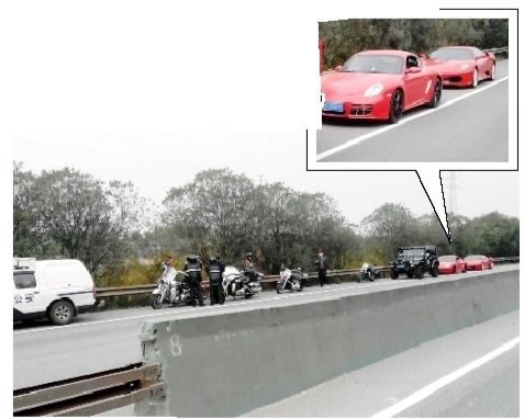 民警示意車隊停靠路邊後對幾位當事人展開了詢問調查,現場有4輛重型摩托車,分別是桂B、湘A等號牌,還有一輛吉普越野車和兩輛法拉利跑車,其中一位摩托車主稱他們是桂林摩托車協會的,開法拉利和吉普的是他們的朋友,專程來為他們保駕護航的。