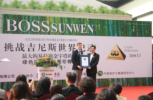 【香港商報訊】記者李苑立報導:11月22日,在吉尼斯認證官現場驗證下,一項新的吉尼斯世界紀錄在廣州誕生。挑戰方BOSSsunwen高級商務男裝品牌團隊在現場成功搭建起一座全球最大的易開罐金字塔,其易開罐總數超過3萬個。易開罐金字塔罐身上的大熊貓圖案和眾多環保主題圖畫作品,由廣州東風東路小學400餘師生通過環保主題繪畫比賽評選出的代表作品組成。