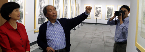 姜林和(中)在向嘉宾介绍作品