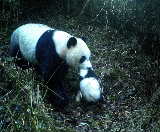 從連續拍出的3張圖片顯示,在長滿鬱鬱蔥蔥的高山箭竹空地中間,一只成年大熊貓媽媽嘴裏叼著一只熊貓幼崽悠然從紅外相機前經過,並迅速走進了位於相機後的箭竹叢後面。“這只熊貓幼崽應該是今年出生的,一般大熊貓幼崽出生後會跟著母親生活,長到兩歲半到三歲的時候才會離開母親。”該縣勿角自然保護區管理處主任胡學煜介紹說,勿角自然保護區內緊鄰王朗自然保護區和白水江自然保護區,核心面積達36349公頃的保護區內遍布野生大熊貓喜食的箭竹、紫箭竹、冷箭及其它竹子,正是這些種類繁多的竹子為野生大熊貓的生存活動提供了充足的食物來源。