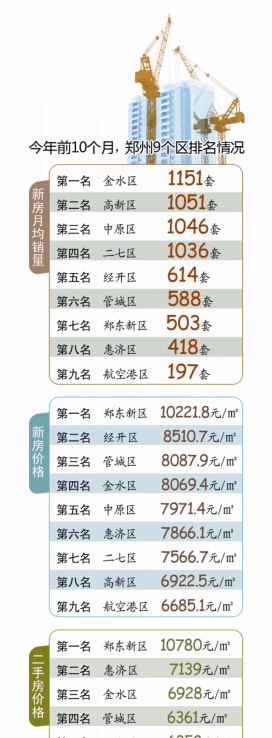 從價格方面看,今年前10個月,新建商品住宅均價排在首位的仍為鄭東新區,10221.8元/平方米,是唯一一個房價過萬元的區域。