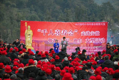 据了解,本次团队是浙江台州第六届“千人喜寿会”活动所属,前五届均在浙江举行,本届活动移师安徽九华山大愿文化园景区。本届台州“千人喜寿会”以寿为主题,今天有1400余人同时迎来寿辰。为确保本次活动的顺利开展,九华山风景区投入大量人力物力保证活动的顺利进行。同时,九华山风景区还精心安排了祈福法会、黄梅戏以及抽奖等特色活动,让万人团队享受到一个愉快欢乐的假期。上午十二时许整个活动圆满结束。
