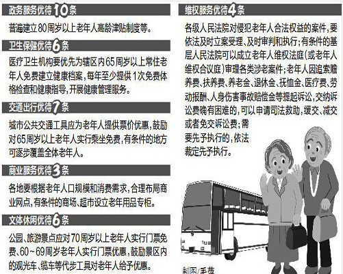 2015年,江西省將實現縣級以上地方人民政府全面建立健全老年人優待政策,社會敬老氛圍更加濃厚,各項優待規定得到有效落實。2020年,實現優待工作管理進一步規范,優待項目進一步拓展,優待水平進一步提升,老年人過上更加幸福的小康生活。據介紹,優待對象為我省60周歲以上老年人,各地可因地制宜,在《意見》基礎上合理確定優待對象和優待標準,率先在衛生保健、交通出行、商業服務、文體休閑等方面實施優待,并根據本地實際情況,逐步拓展優待內容和范圍。常住本行政區域內的外埠老年人享受同等優待。