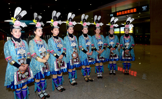 身着贵州少数民族盛装的志愿者在贵阳北站迎接贵广高铁首发团游客