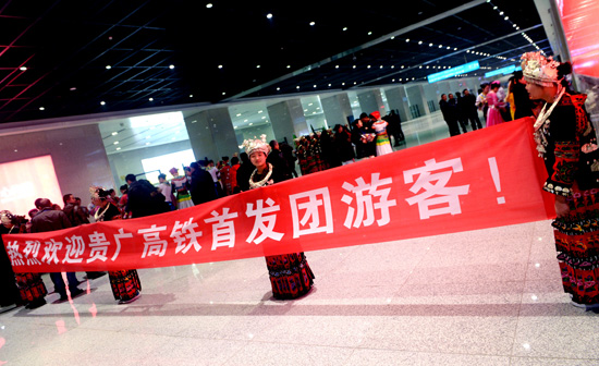 在貴陽北站,身著貴州各少數民族盛裝的高校志願者在貴陽北站出站大廳迎接貴廣高鐵首發團遊客。出站口顯眼橫幅寫著:乘貴廣高鐵·品多彩貴州·游爽爽貴陽、熱烈歡迎貴廣高鐵首發團遊客。
