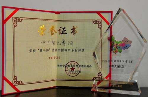 九寨沟喜获全国首届“蒙牛杯”美丽中国城市乡村评选TOP20称号证书和奖牌.