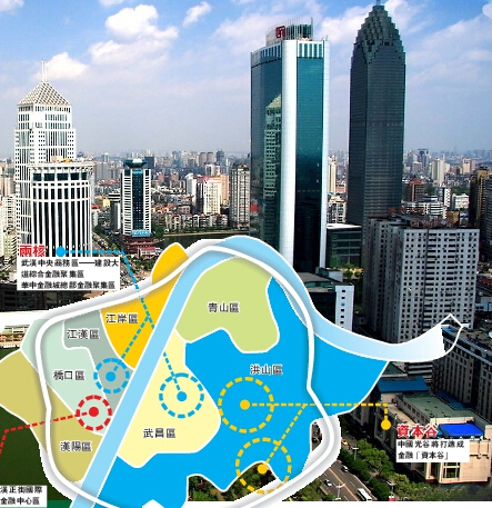 多年來,金融產業資源分散和地標性功能區的缺失,武漢金融產業一直難以產生如香港中環、上海陸家嘴這樣的金融高地,大大限制了武漢金融產業的發展。為解決上述問題,武漢在區域金融中心空間布局上確定了「一心、兩核、資本谷」的空間結構。