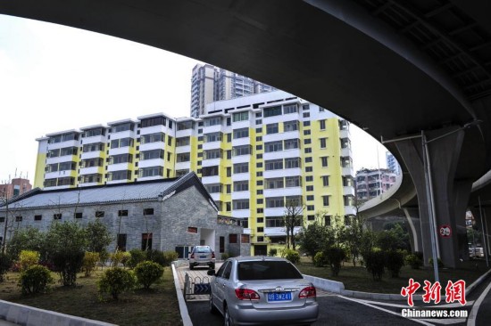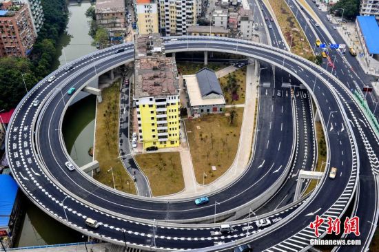 1月26日,位於廣州市永興街30號一居民樓四周被洪德立交圈包圍。近日,廣州洲頭咀隧道正式通車,一居民樓被洪德立交圈在其中,形成“圈中樓”。中新社發陳驥旻 攝