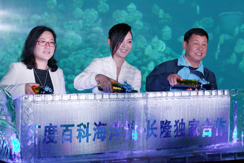 百度百科负责人阮瑜(左)、横琴海洋王国副总经理张德录(右)及超人气实力派女歌手周笔畅(中)共同启动了“百科海洋馆”的上线