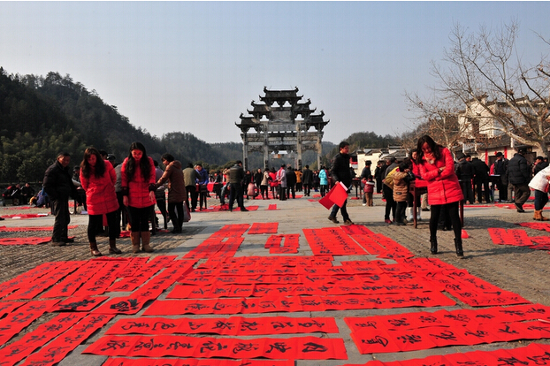 2014年10月,西遞鎮啟動了“桃花源里迎新春,遺產地內征佳聯——第二屆西遞古鎮全國春聯征集大賽”活動,得到了全國各地春聯愛好者的積極響應,共征集到近1500副春聯作品。為使西遞景區線路上景點戶的近200余副春聯各具特色、內容切合景點特點,該鎮特意邀請了黟縣徽文化聯誼會的專家余重陽、余治淮對每個景點的春聯內容進行了精心挑選,并邀請近30位書法家傾情揮墨,為全村每家每戶共書寫了春聯1000余副。一副副春聯成為春節期間西遞景區的一道亮麗風景,寓意著西遞正紅紅火火的邁步前進。
