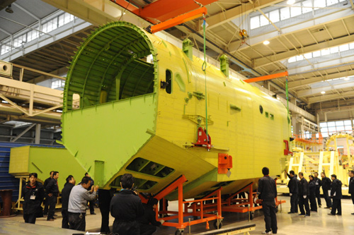 2014年12月29日,大型灭火水上救援水陆两栖飞机AG600进入工程制造阶段,首个大部件机身中段成功下架。目前该机型已获得两架意向订单