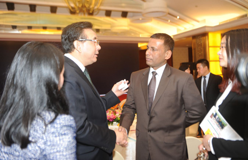 宜宾早茶品介会上宜宾市人民政府市长徐进与斯里兰卡驻成都领事馆领事坎迪潘亲切交流