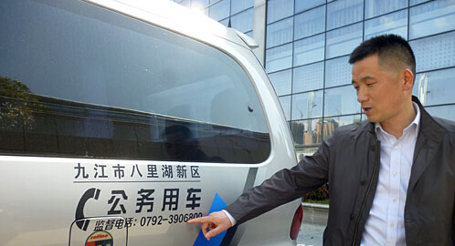 記者看到,“公務用車”的標識統一貼在車尾兩側,上方是“九江市八里湖新區”字樣,中間是“公務用車”幾個大字,下方打上“監督電話:0792-3906809”字樣,整個標識簡潔而醒目,即使是在距離車輛50米的地方,都能看得清楚上面的字。
