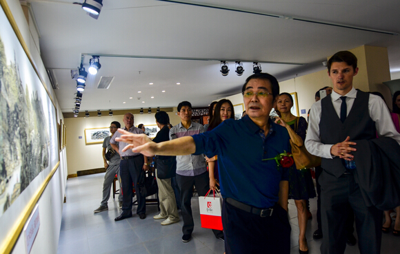 4月26日,中國美術家協會副主席,廣西壯族自治區政協副主席,全國政協常委黃格勝向外國友人介紹傳統國畫。