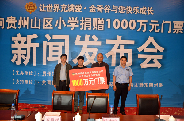 【香港商報網訊】記者 黃慶松 報道:4月28日,貴州鎮遠縣舉行“讓世界充滿愛·金奇穀與您快樂成長”新聞發布會,貴州績曲文化旅遊有限公司向貴州山區學生捐贈了1000萬元門票,68200餘名學生和9750名老師將免費到鎮遠縣青溪金奇穀酒文化親子遊樂觀光體驗園進行體驗觀光。