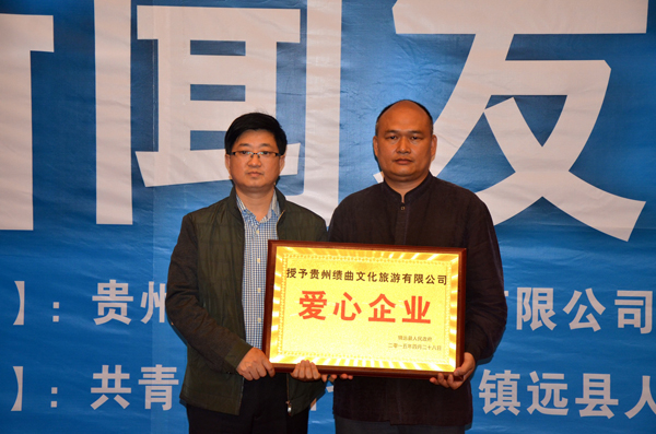 镇远县人民政府常务副县长袁世泽向“爱心企业”贵州绩曲文化旅游有限公司授牌
